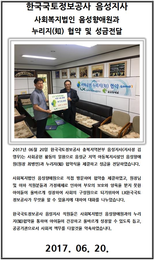 [LX충북지역본부 음성지사] 사회복지법인 음성향애원과 누리지(知) 협약 및 성금 전달