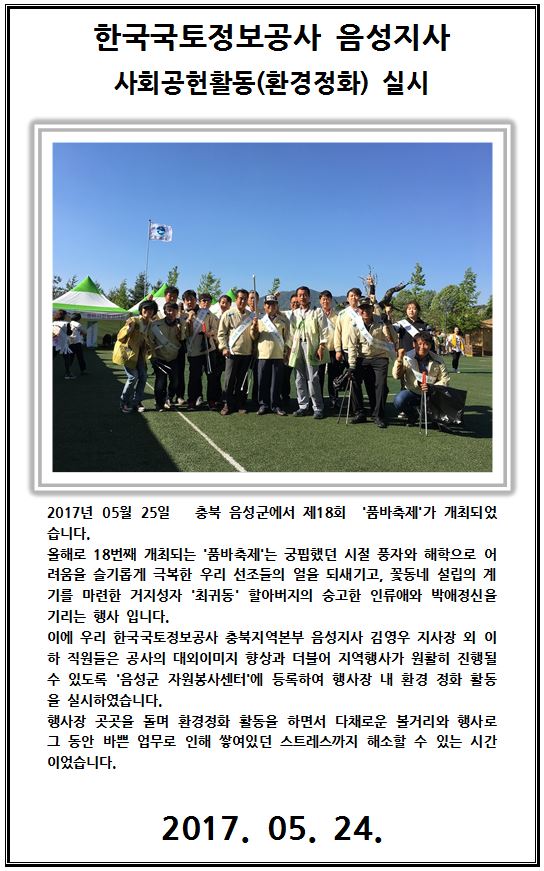 [충북지역본부 음성지사] 음성군 '품바축제' 사회공헌활동(환경정화) 실시