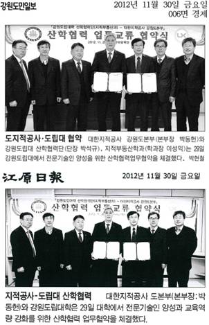 대한지적공사 강원도본부와 강원도립대학은 29일 강원도립대학에서 전문기술인 양성과 교육역량강화를 위한 산학협역업무협약을 체결하였습니다.