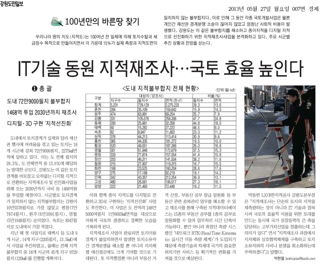 라는 제목으로 2013년 5월 27일 월요일 경제면 제 7페이지에 지적재조사에 대한 기사가 실렸습니다.