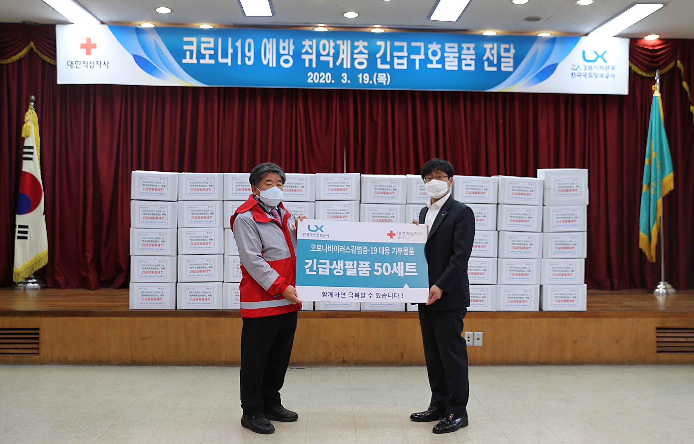한국국토정보공사(LX) 강원지역본부(본부장 직무대리 김정권)는 19일 코로나19 재난극복 및 지역사회 상생을 위해 긴급생필품 꾸러미 50세트를 마련하여 대한적십자사 강원도지사에 전달했다.