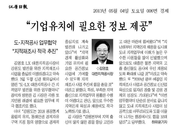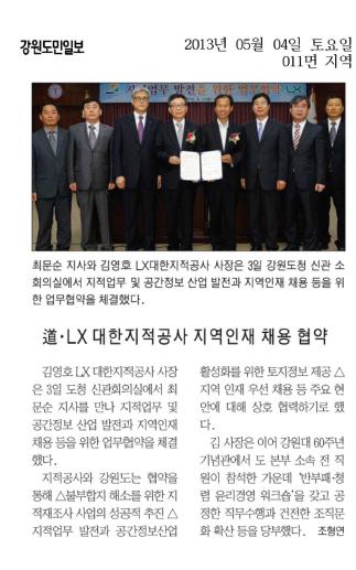 5월 3일 LX대한지적공사와 강원도청에 체결한 MOU보도자료입니다.