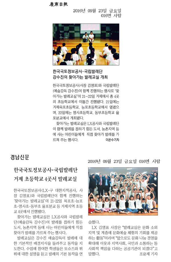 9월 21~22일 경남 거제지역 초등학교에서 진행된 찾아가는 발레교실 관련 보도자료입니다.