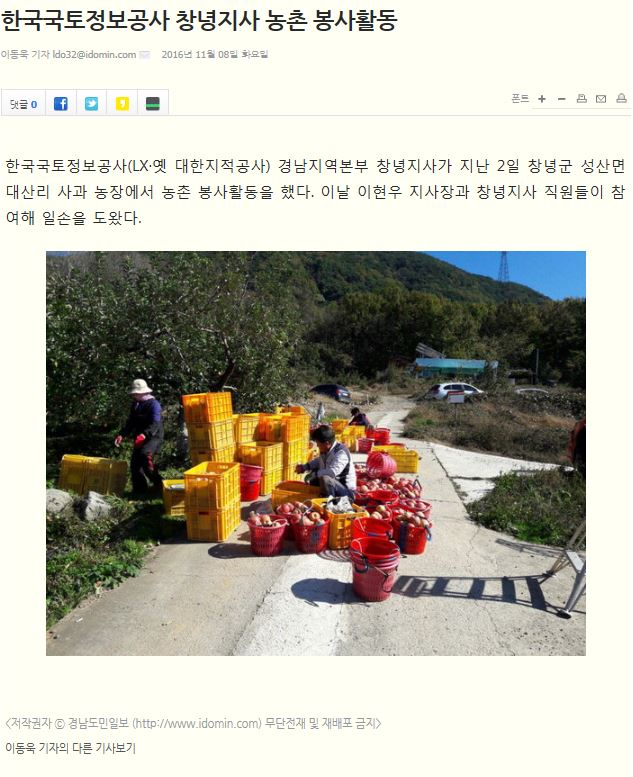 11월 8일자로 경남도민일보에 보도 된 창녕지사 봉사활동 관련 내용입니다.