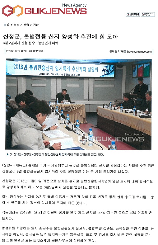 2018년 2월 8일 산청군은 불법전용산지 임시특례 추진 설명회를 열어