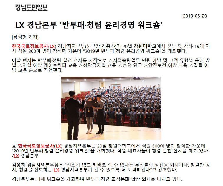 2019.05.21. 저희 본부 청렴윤리경영 워크숍 관련 보도자료가 경남일보 및 경남도민일보에 게재되었습니다.