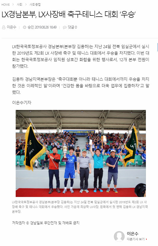 2019.08.27.(화) 경남일보, 경남신문에 LX사장배 축구, 테니스대회 우승 관련 보도자료가 게재되었습니다.