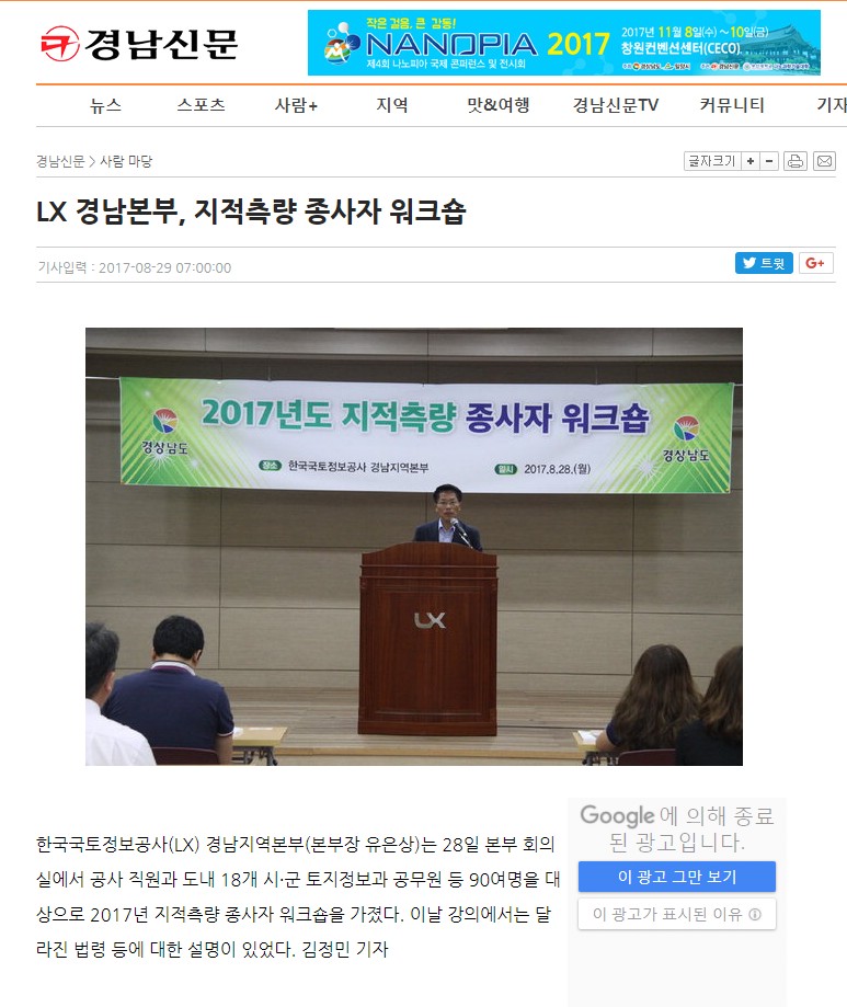 한국국토정보공사(LX, 구 대한지적공사) 경남지역본부(본부장 유은상)는 28일(월) 본부 5층 회의실에서 2017년 지적측량 종사자 워크숍을 개최하였습니다.