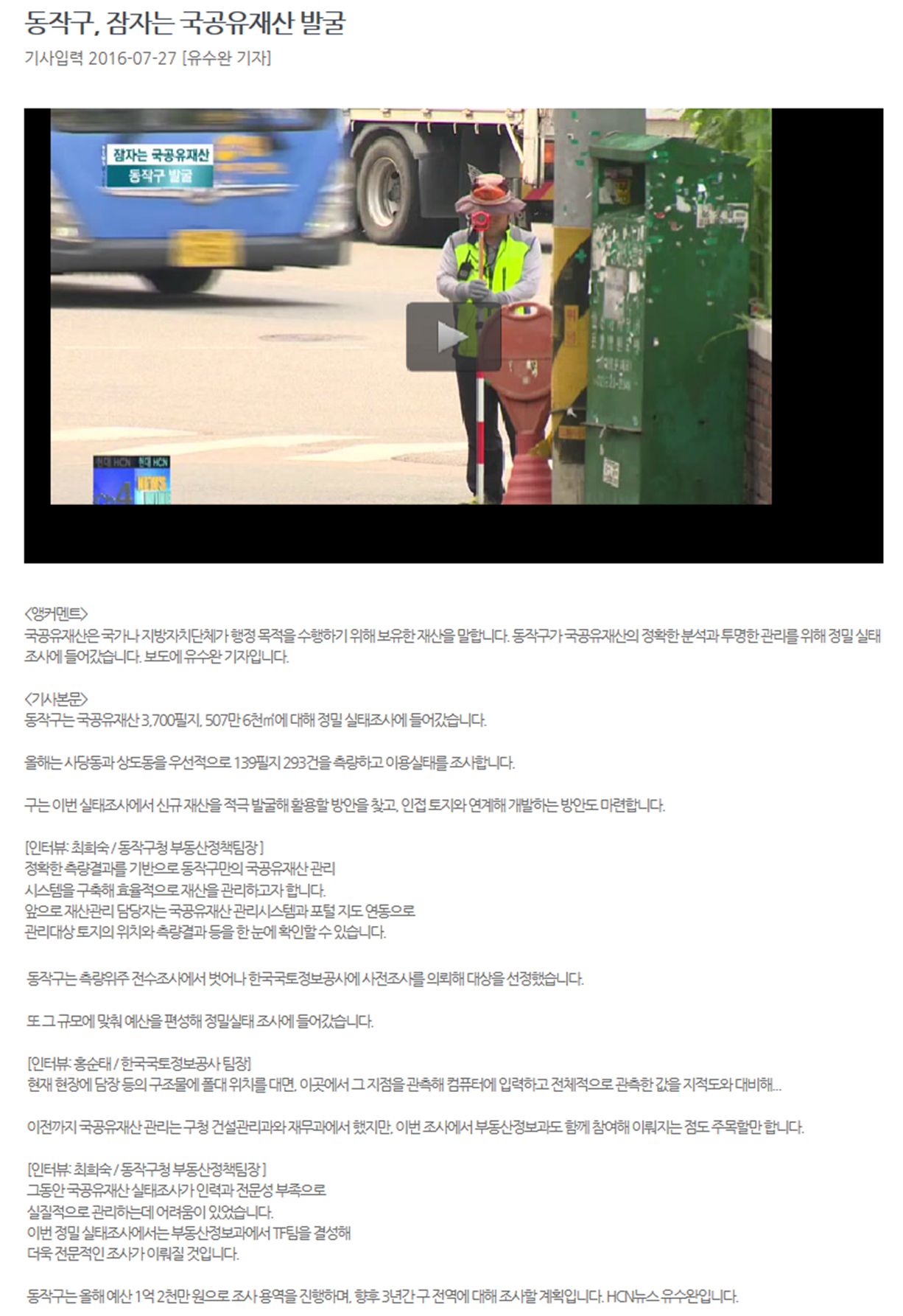 LX 서울지역본부에서 수행한 동작구 국공유재산 정밀실태조사 사업이 뉴스에 소개되었습니다.